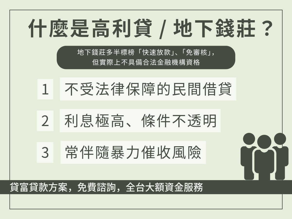 | 利率水準 | 以年利率 6 %~16 % 左右喊價 | 可能以月利率、日息或週息計算,年息動輒 50% 以上 |