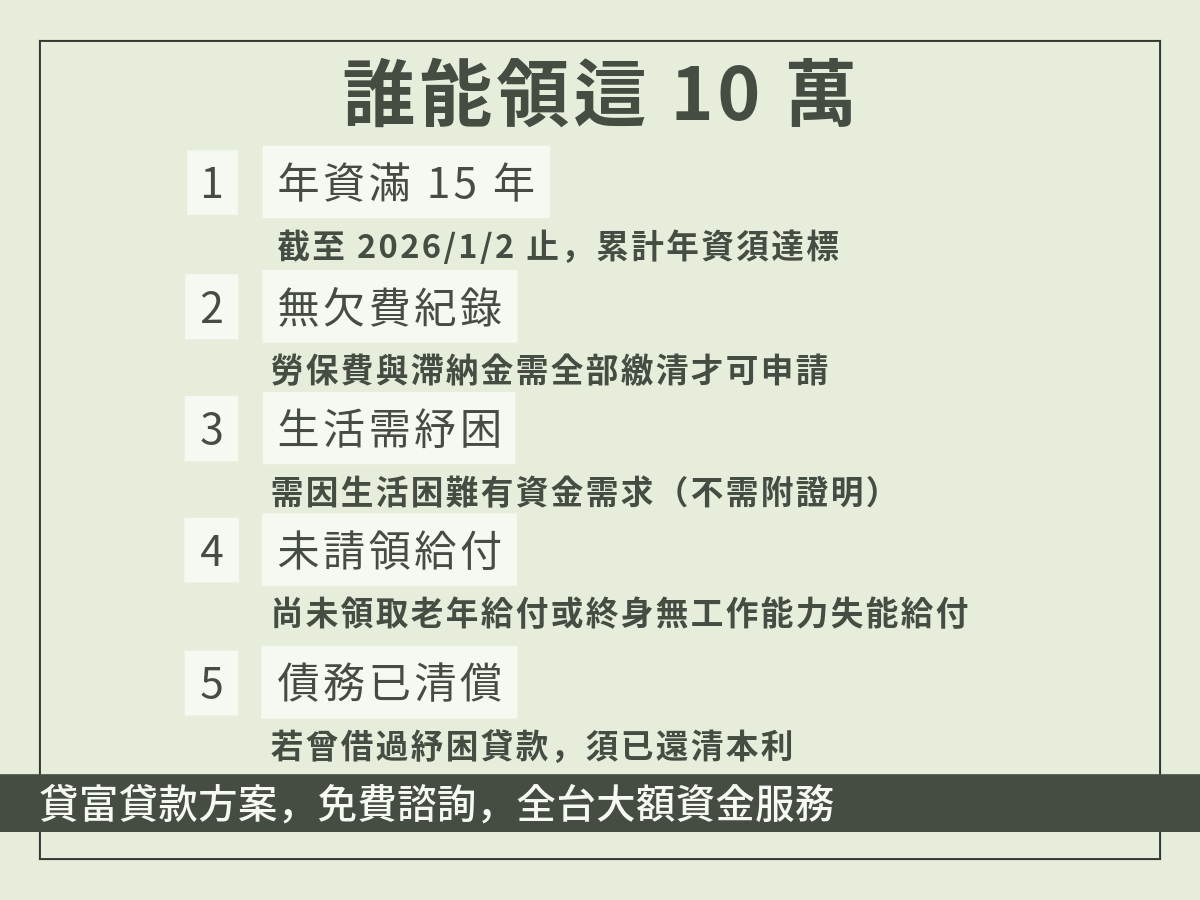 除了額度有限之外,這也不是所有有勞保的人都能申請。官方公告的資格通常包括:有生活困難需要紓困、參加勞工保險年資滿 15 年、無欠繳勞工保險費及滯納金,且未曾借貸勞保紓困貸款,或曾借貸但已繳清本金及利息。