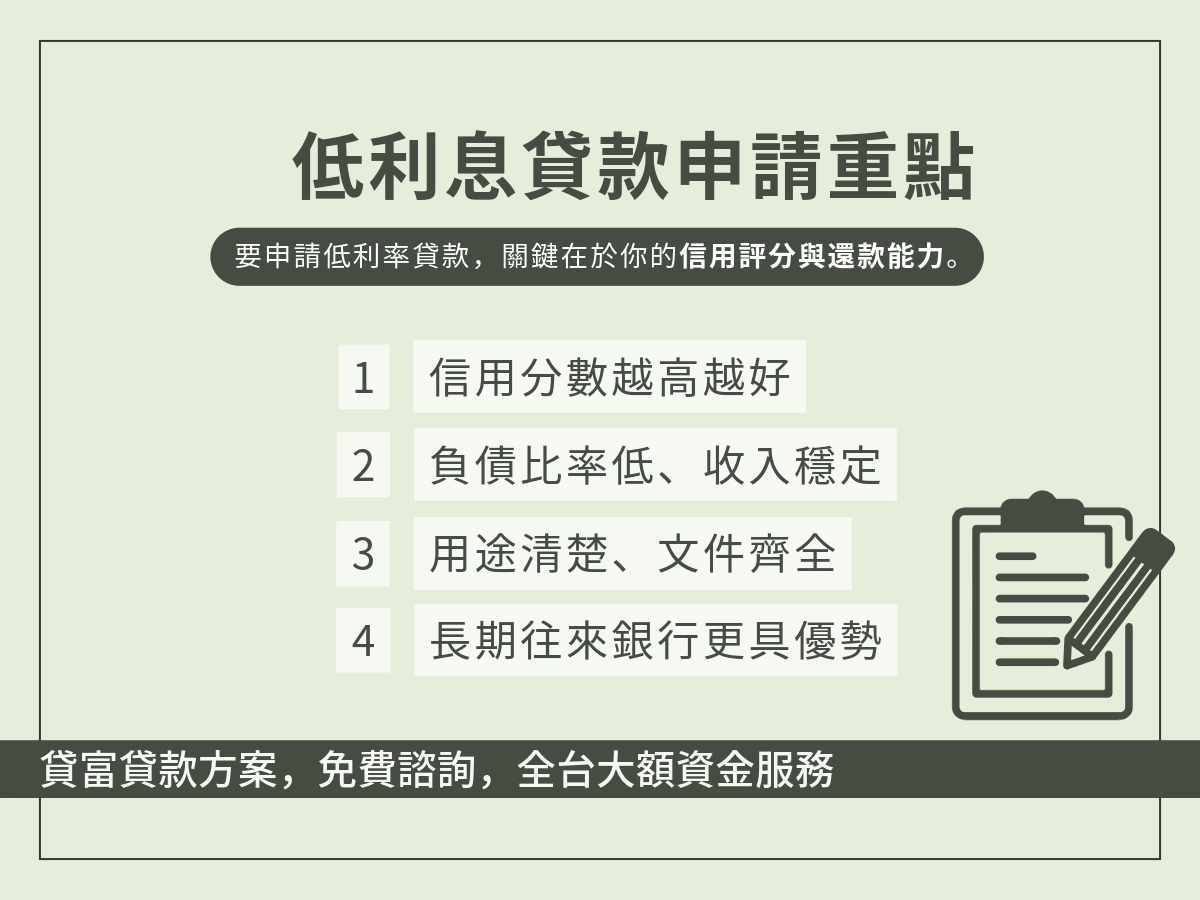 畢竟貸款是有求於人去申請,既然是低利息應該大家一窩蜂都會去申請,而到底是什麼原因才能夠滿足低利息貸款?