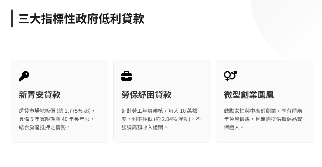 在政策性的補貼與房產這項抵押品的情況下,促成了台灣市場上最低利息(利率 1.775% 起)的貸款方案。