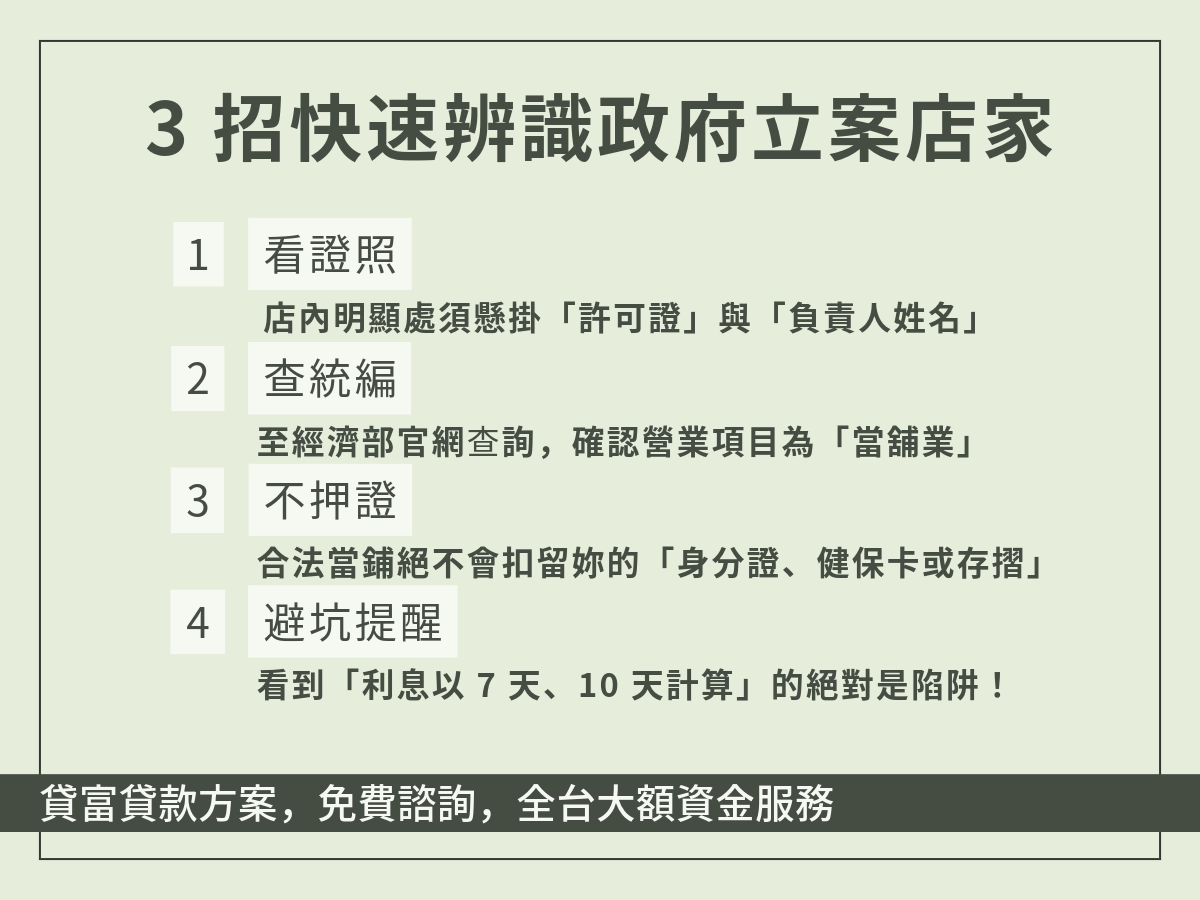合法當鋪會在店內公告利率計算方式。如果利率含糊、口頭說一個數字但不肯寫在合約上,那就有問題。