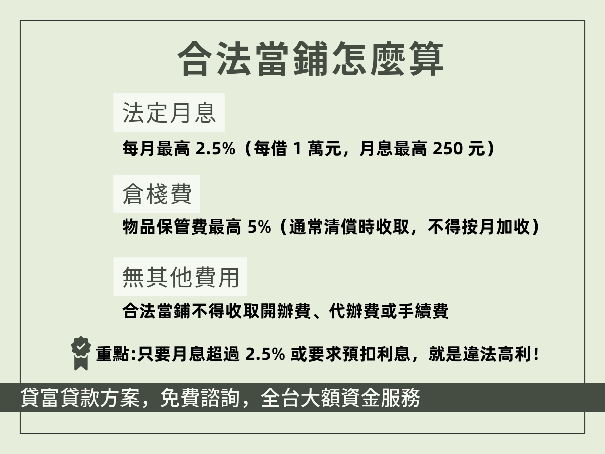 當鋪借錢的法定利率上限是年利率 30%,換算成月息大約 2.5%。