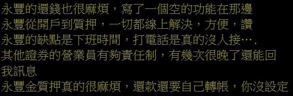 網路上對於永豐銀行、永豐金證券的股票質押心得沒有很多,利率中規中矩,但是還款方式只能自己手動轉帳,相當不方便。