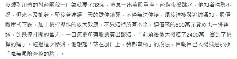 就像今年 4 月的川普關稅事件,導致股市大幅下跌,不少質押股票的投資者不只面臨追加保證金的壓力,有些甚至遭到強制平倉,造成潛在損失